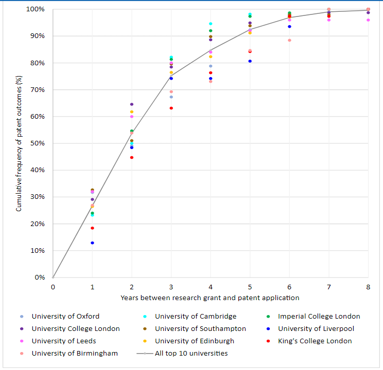 Figure 13: Cumulative frequency of published patent outcomes with a given number of years between receipt of a research grant and patent application date, by university applicant. Includes all patent publications and granted patents applied for by the top 10 universities, following receipt of grant funding by one of the seven research councils 2010-2020.