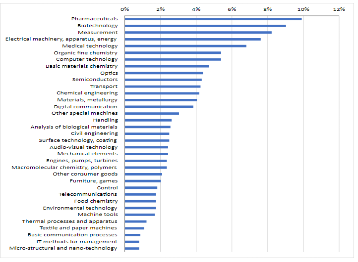 Patents reported by research grant holders are most frequently filed in the fields of pharmaceuticals (10%), biotechnology (9%), measurement (8%), electrical machinery, apparatus, energy (8%) and medical technology (7%).