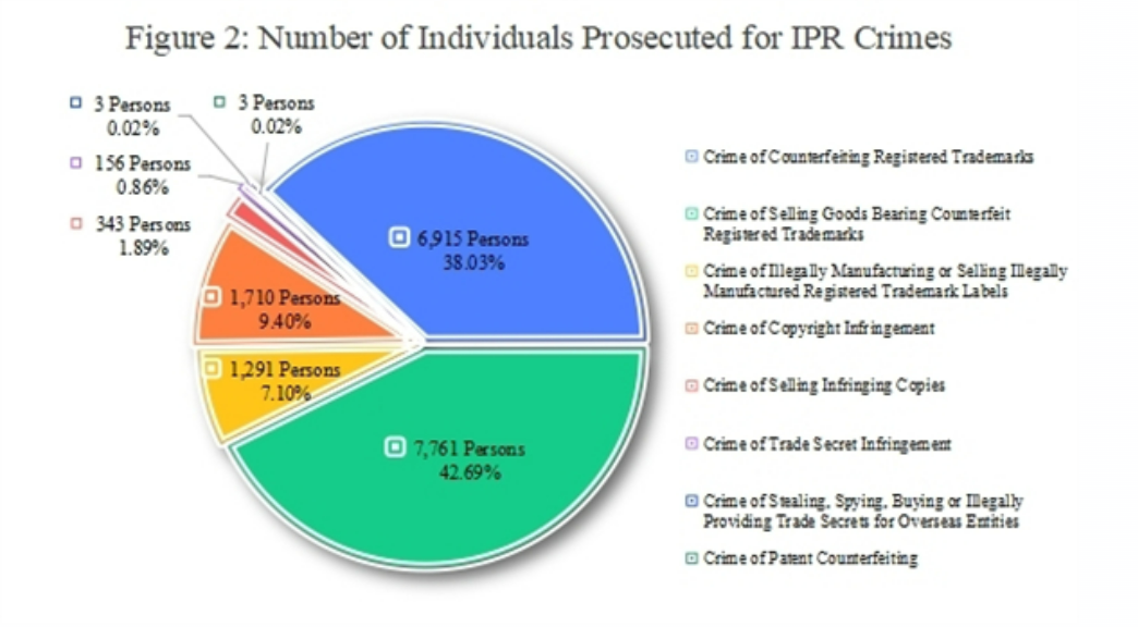 1.1 Cracking Down on All Types of IPR Infringement Crimes in Accordance with the Law. Procuratorates approved arrests in 1,461 cases involving 2,273 persons suspected of the crime of counterfeiting registered trademarks, and prosecuted 3,255 cases involving 6,915 persons; approved arrests in 1,439 cases involving 2,079 persons suspected of the crime of selling goods bearing counterfeit registered trademarks, and prosecuted 3,743 cases involving 7,761 persons; approved arrests in 197 cases involving 259 persons suspected of the crime of illegally manufacturing or selling illegally manufactured registered trademark labels, and prosecuted 519 cases involving 1,291 persons; approved arrests in 246 cases involving 368 persons suspected of the crime of copyright infringement, and prosecuted 894 cases involving 1,710 persons; approved arrests in 70 cases involving 90 persons suspected of the crime of selling infringing copies, and prosecuted 162 cases involving 343 persons; approved arrests in 40 cases involving 89 persons suspected of the crime of trade secret infringement, and prosecuted 71 cases involving 156 persons; prosecuted 2 cases involving 3 persons suspected of the crime of stealing, spying, buying, or illegally providing trade secrets for overseas entities; approved arrests in 2 cases involving 2 persons suspected of the crime of patent counterfeiting, and prosecuted 1 case involving 3 persons.