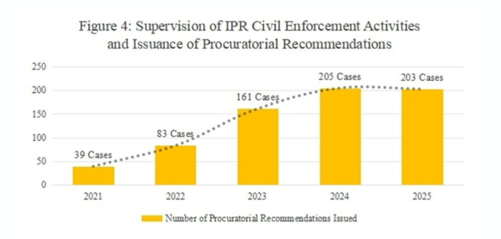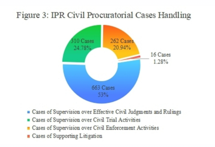 Procuratorates at all levels handled 1,251 IPR civil procuratorial cases, including 663 cases of supervision over effective civil judgments and rulings, 310 cases of supervision over civil trial activities, 262 cases of supervision over civil enforcement activities, and 16 cases of supporting litigation.