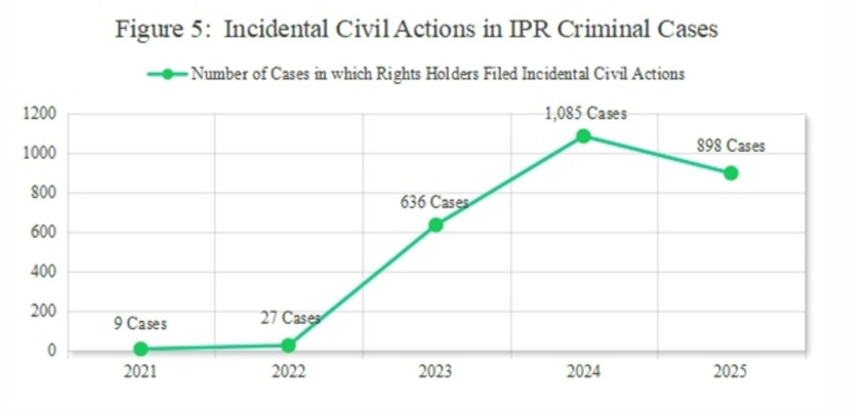 2.4 Promoting Incidental Civil Actions in IPR Criminal Cases. In the prosecuted IPR criminal cases, procuratorates ensured that rights holders filed 898 incidental civil actions, accounting for 9.8%, effectively reducing the cost of rights protection and alleviating the burden of litigation on rights holders.