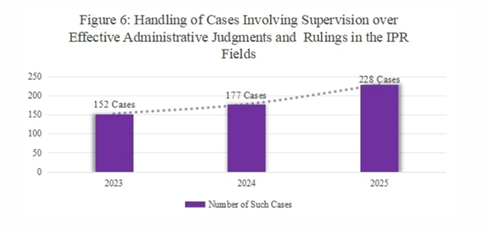 Procuratorates at all levels handled 1,795 IPR administrative procuratorial cases, including 228 cases of supervision over effective administrative judgments and rulings, 10 cases of supervision over administrative trial activities, 24 cases of supervision over administrative enforcement activities, and 1,533 cases of reverse transfer between administrative enforcement and criminal justice.