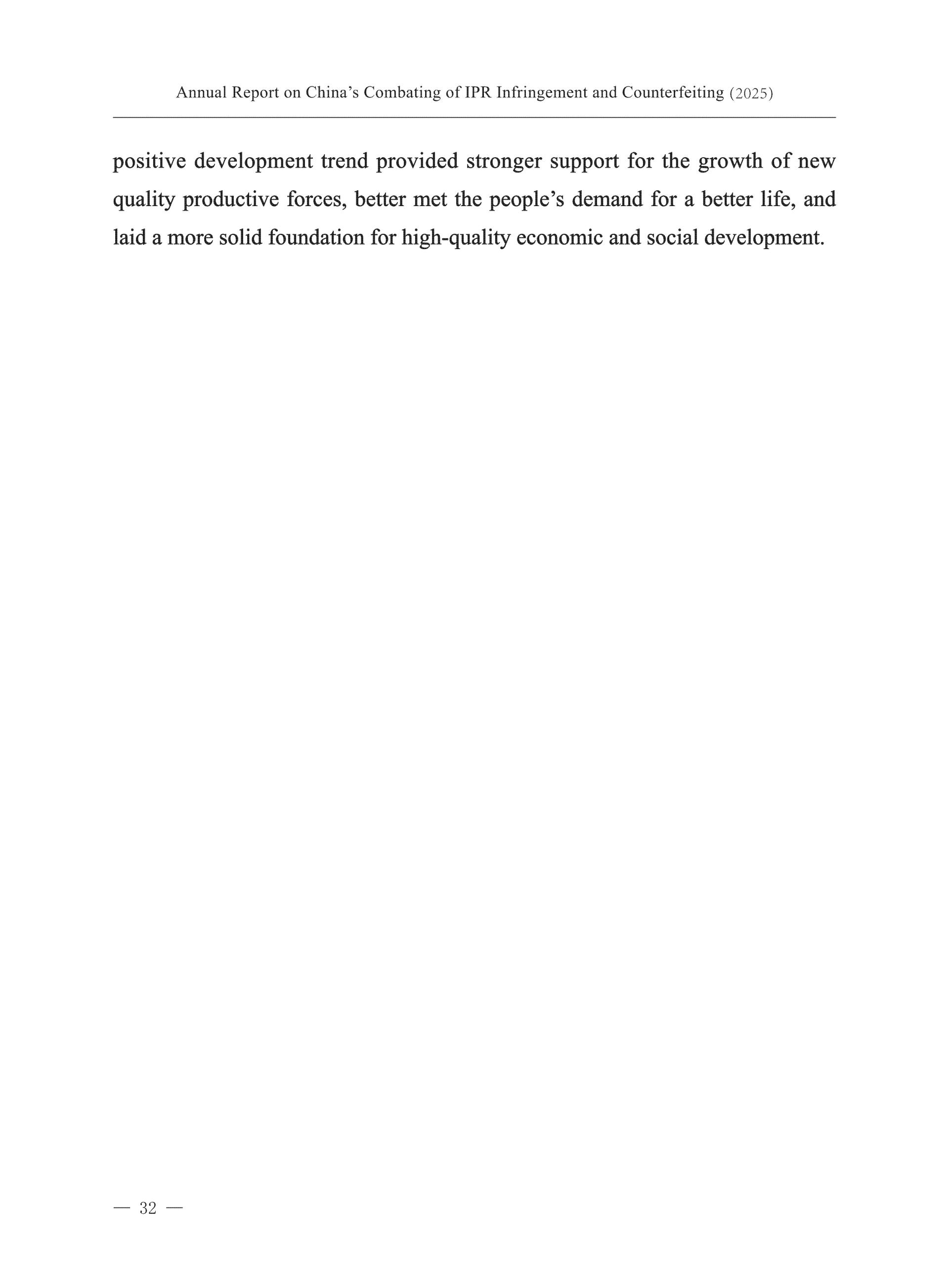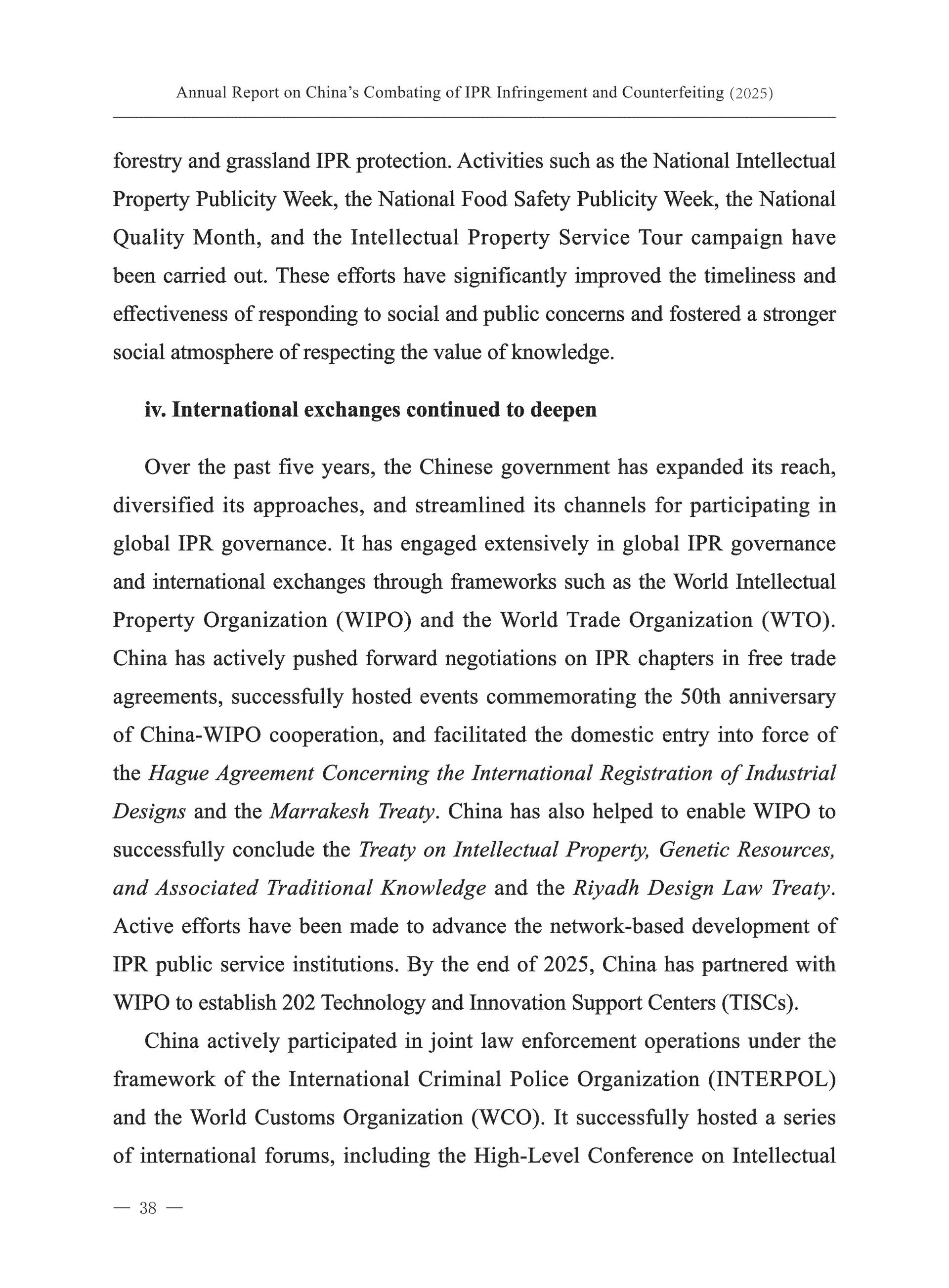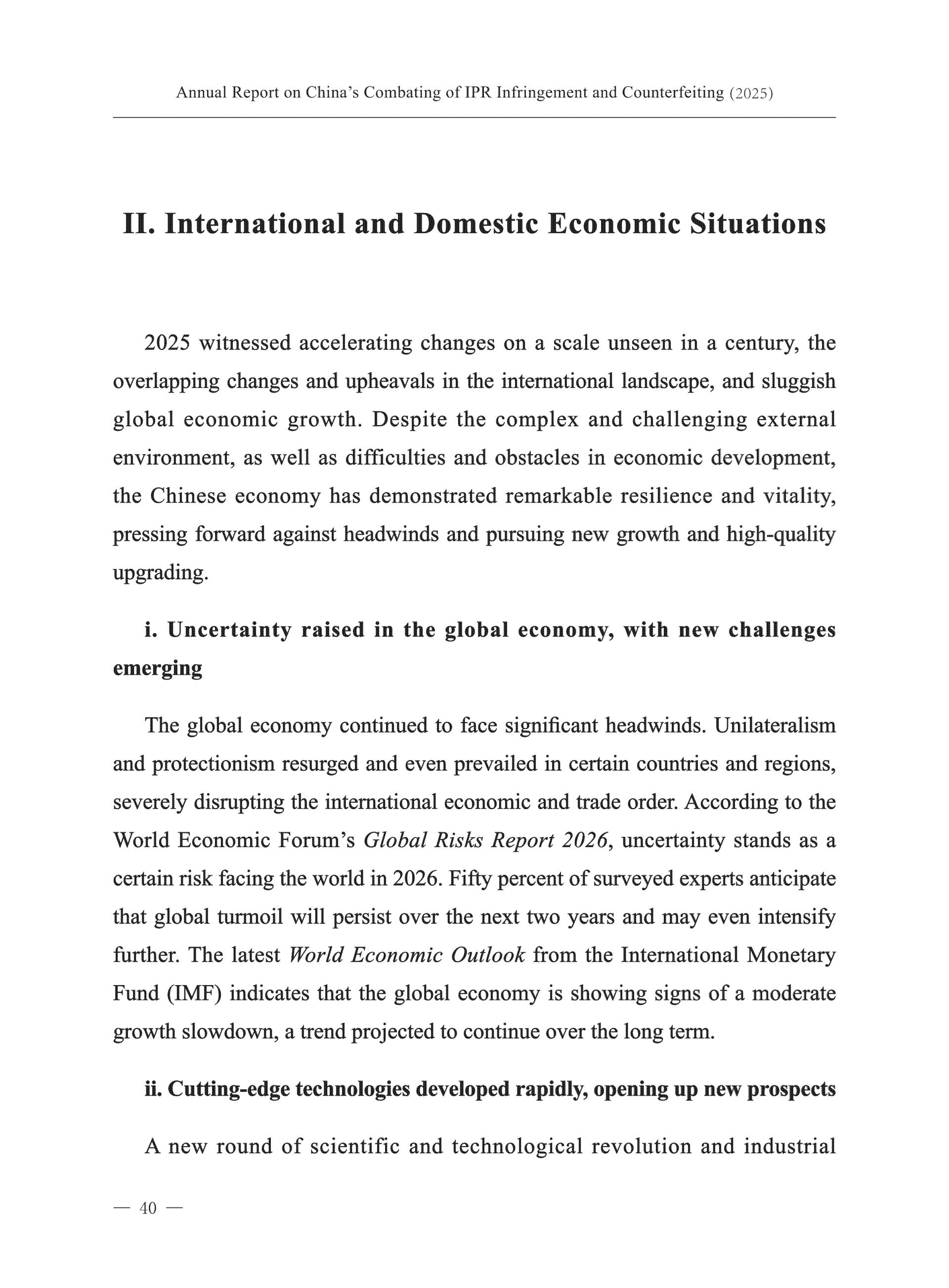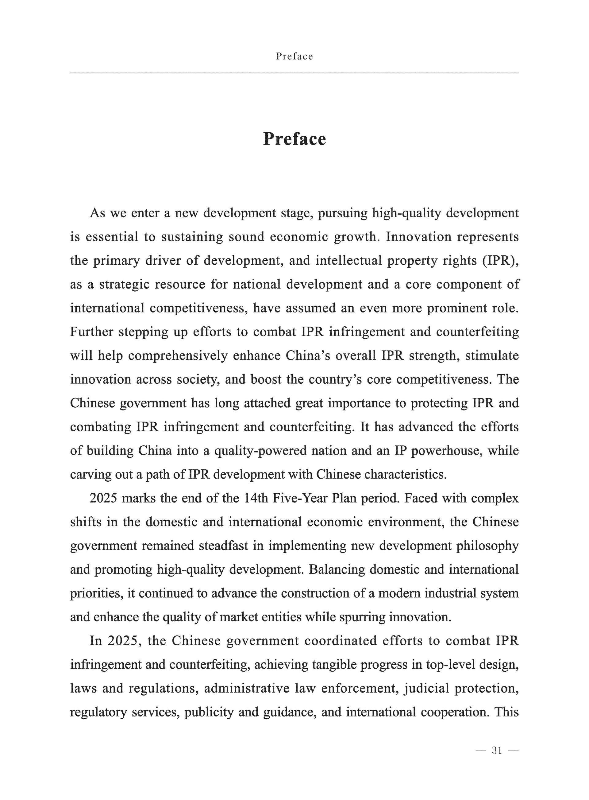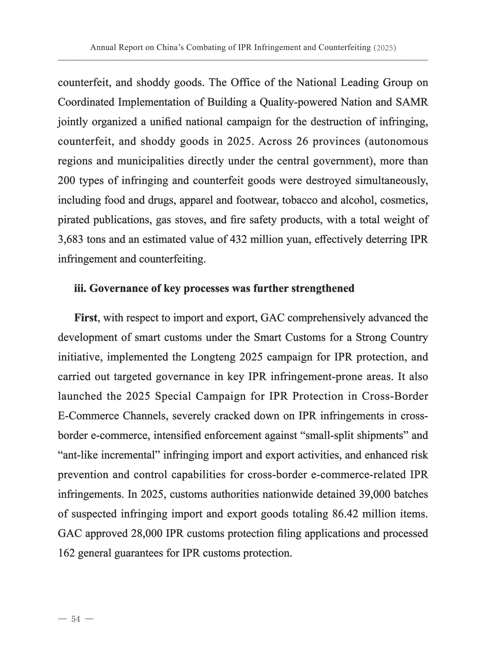 The Report summarizes China’s work on intellectual property protection and combating counterfeiting and infringement during the 14th Five-Year Plan period, analyzes the domestic and international economic situation in 2025, and comprehensively elaborates on the progress and achievements of China’s efforts in combating counterfeiting and infringement in 2025 from seven aspects: coordinated advancement, legal guarantees, administrative enforcement, judicial protection, regulatory services, publicity and guidance, and international cooperation. The Report is released bilingually in Chinese and English, enhancing the international community’s understanding of China’s efforts in combating counterfeiting and infringement.