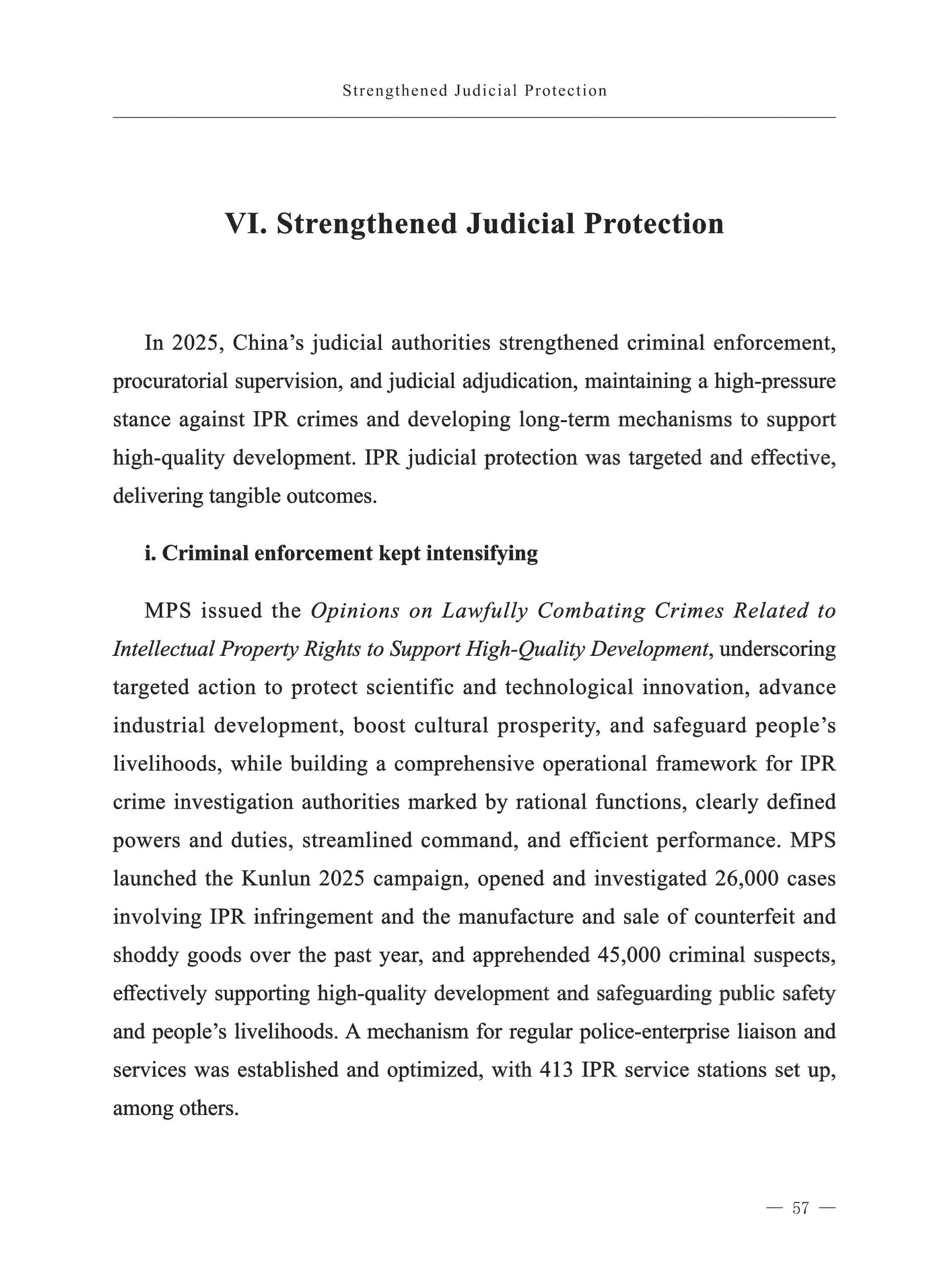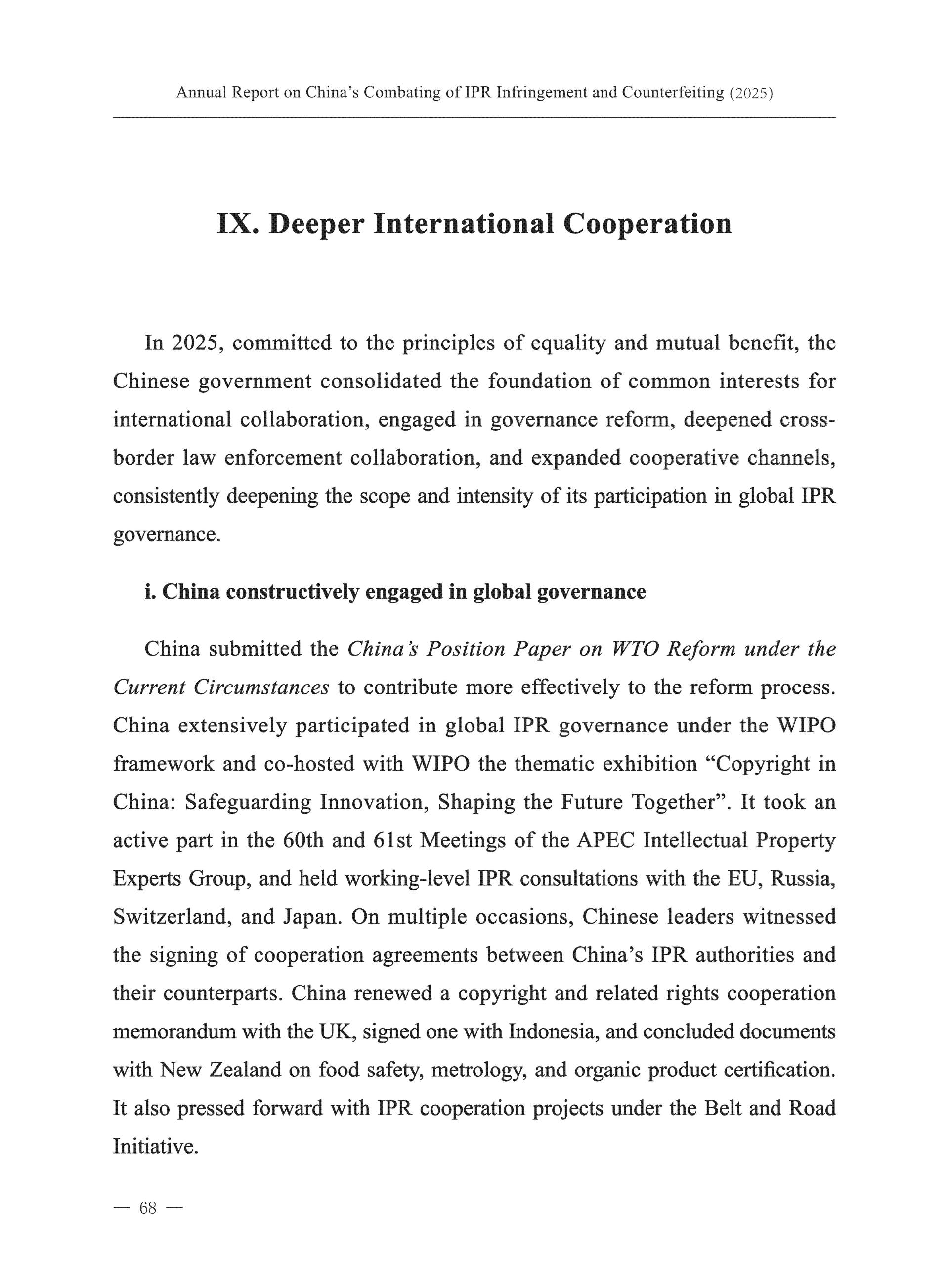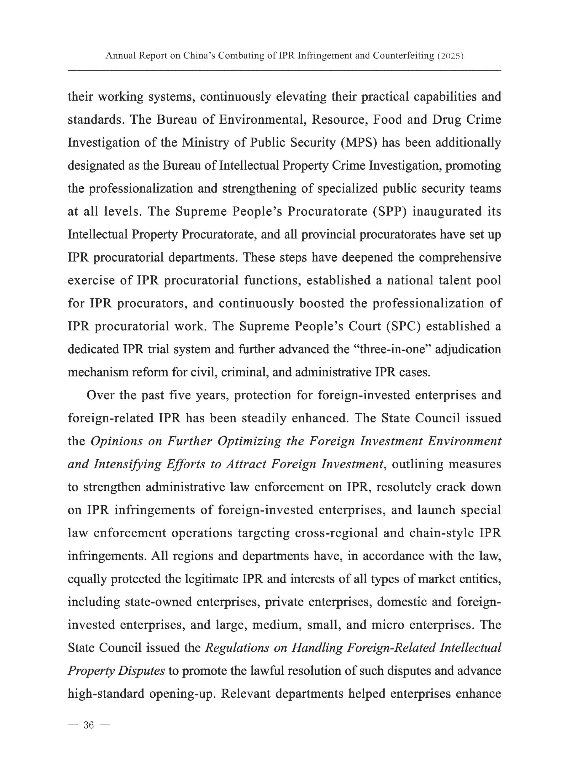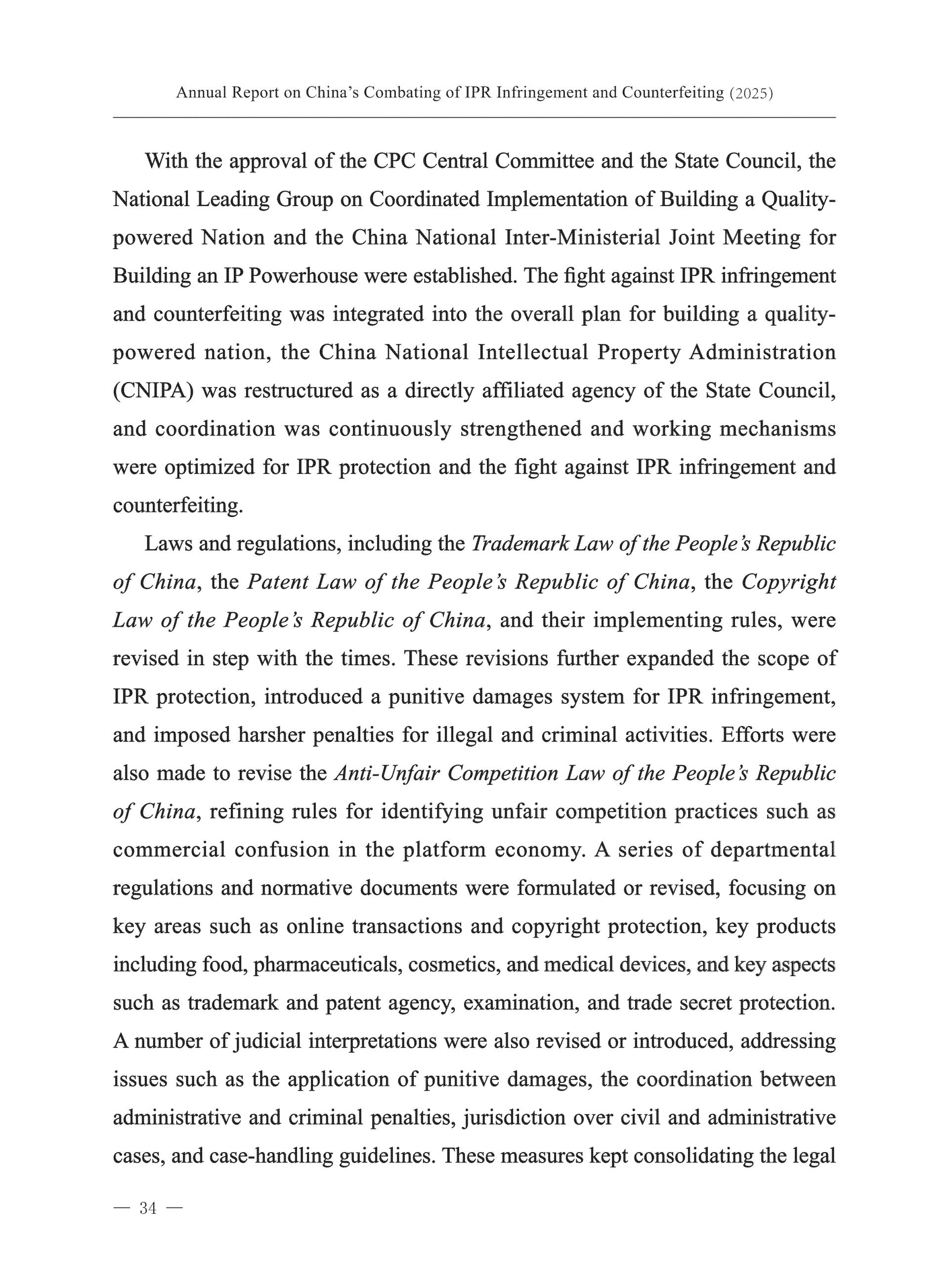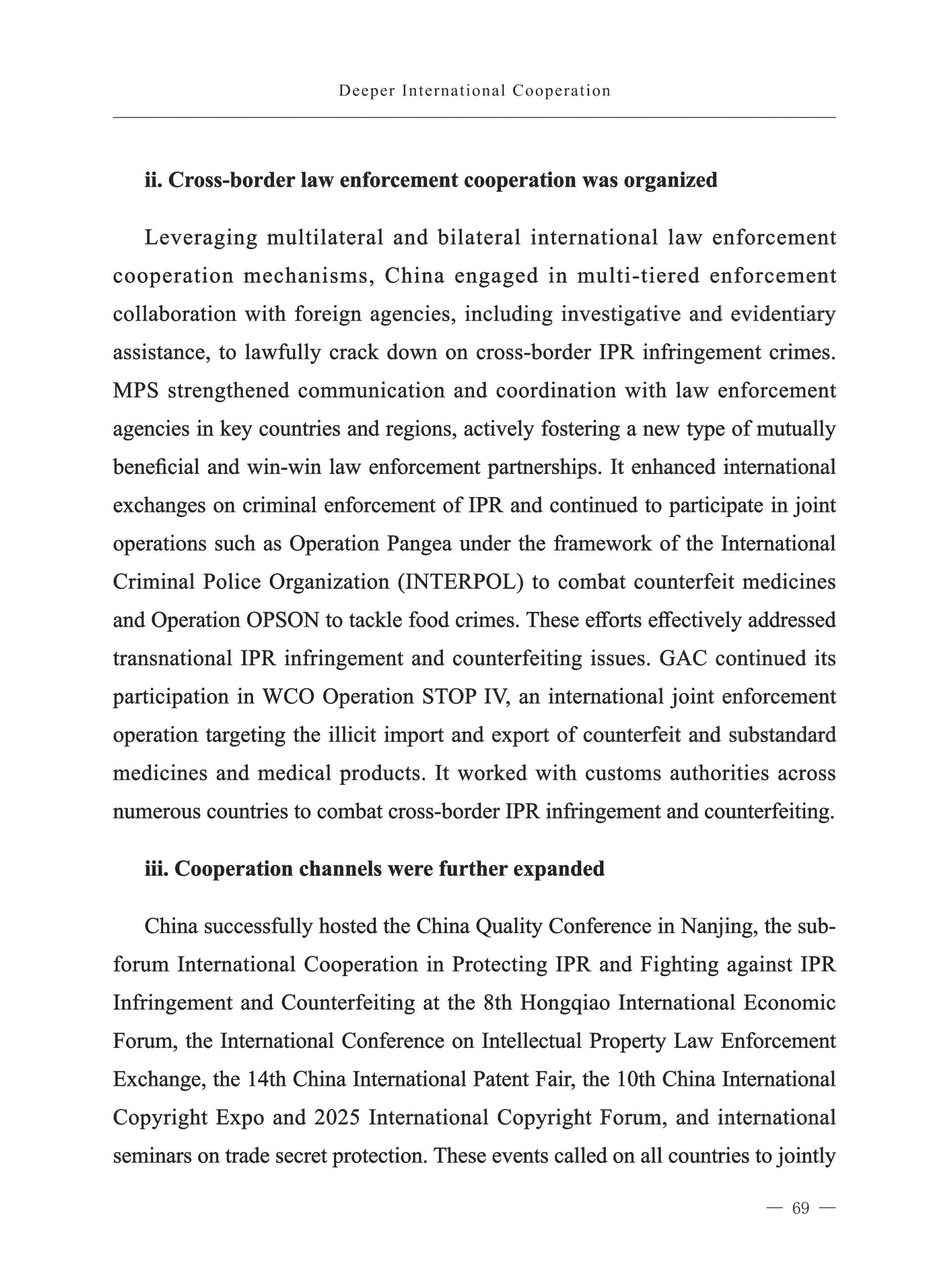 The Report summarizes China’s work on intellectual property protection and combating counterfeiting and infringement during the 14th Five-Year Plan period, analyzes the domestic and international economic situation in 2025, and comprehensively elaborates on the progress and achievements of China’s efforts in combating counterfeiting and infringement in 2025 from seven aspects: coordinated advancement, legal guarantees, administrative enforcement, judicial protection, regulatory services, publicity and guidance, and international cooperation. The Report is released bilingually in Chinese and English, enhancing the international community’s understanding of China’s efforts in combating counterfeiting and infringement.
