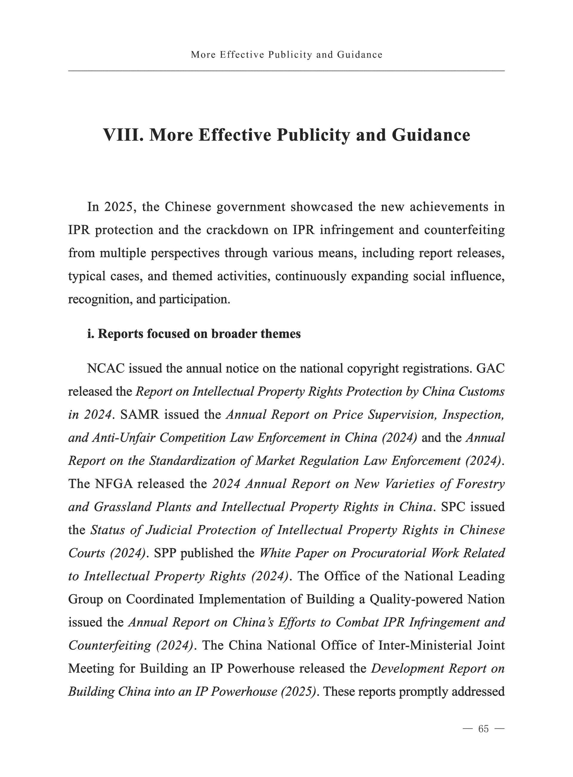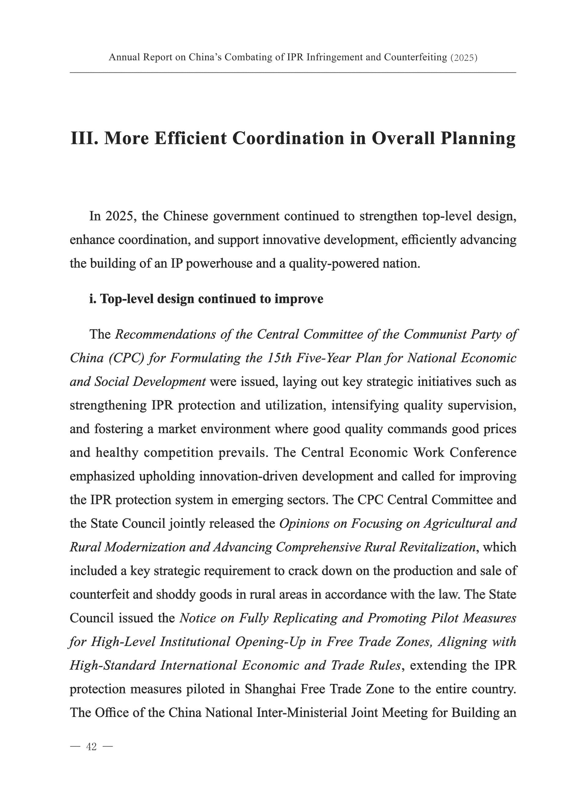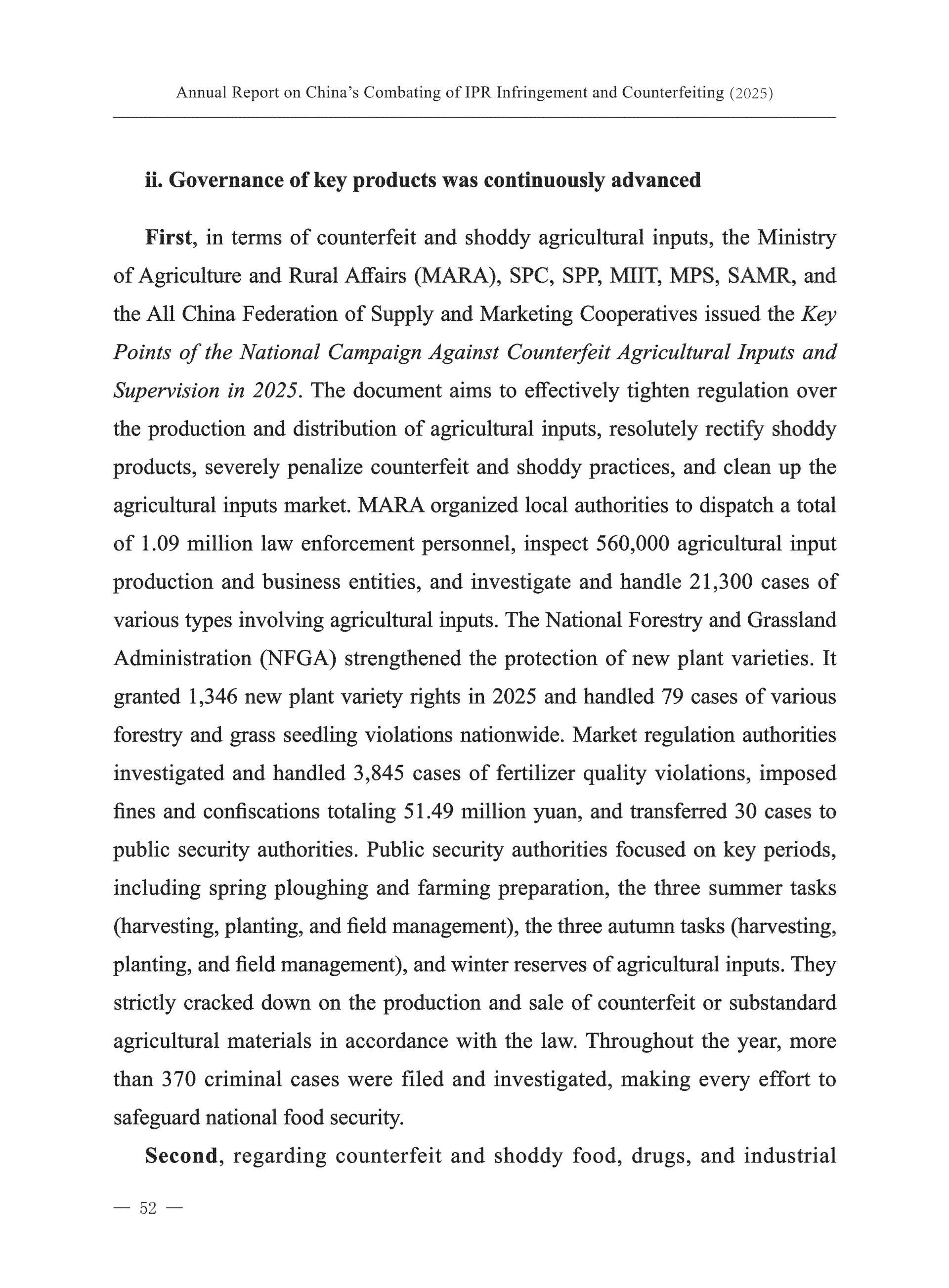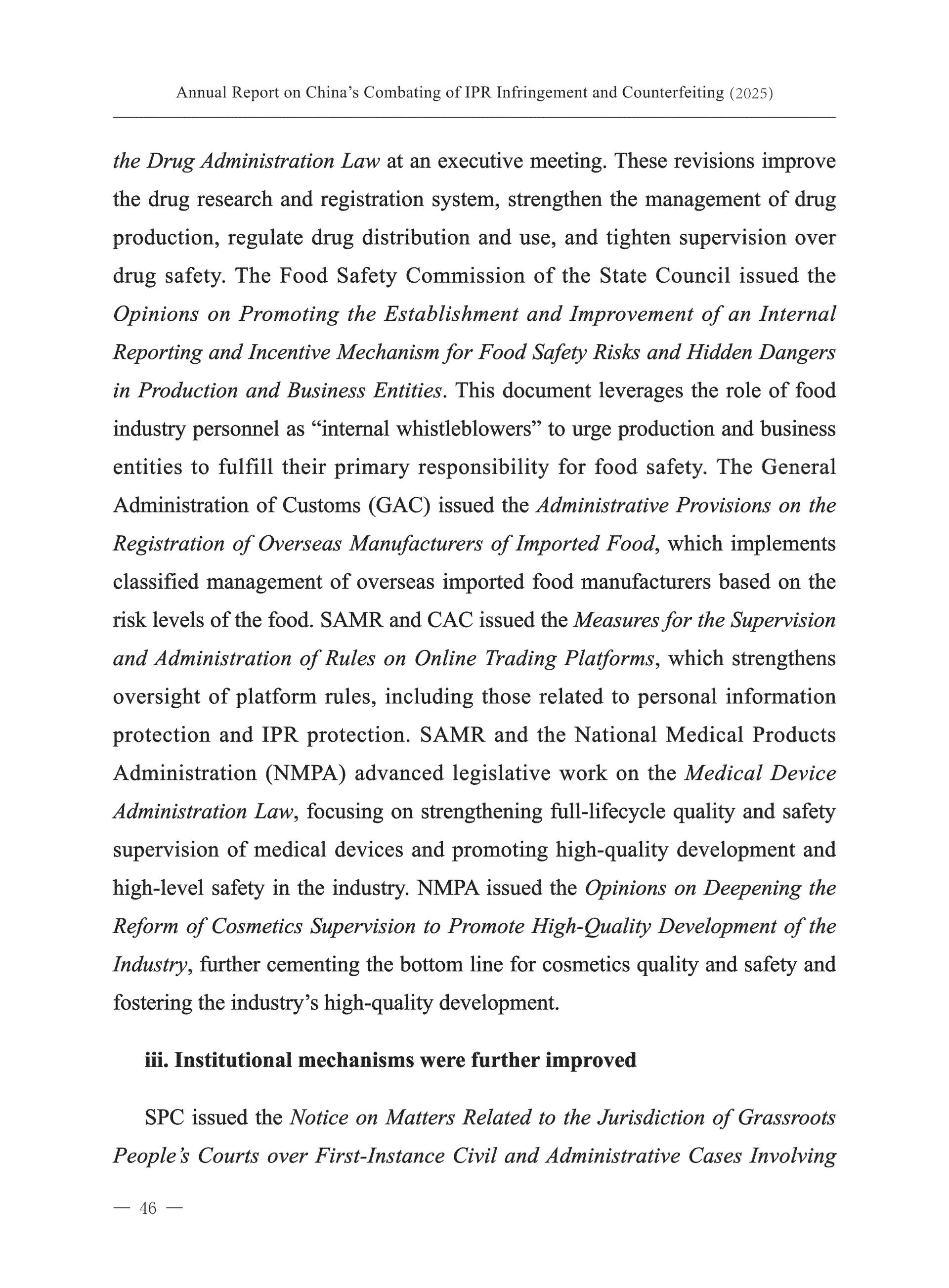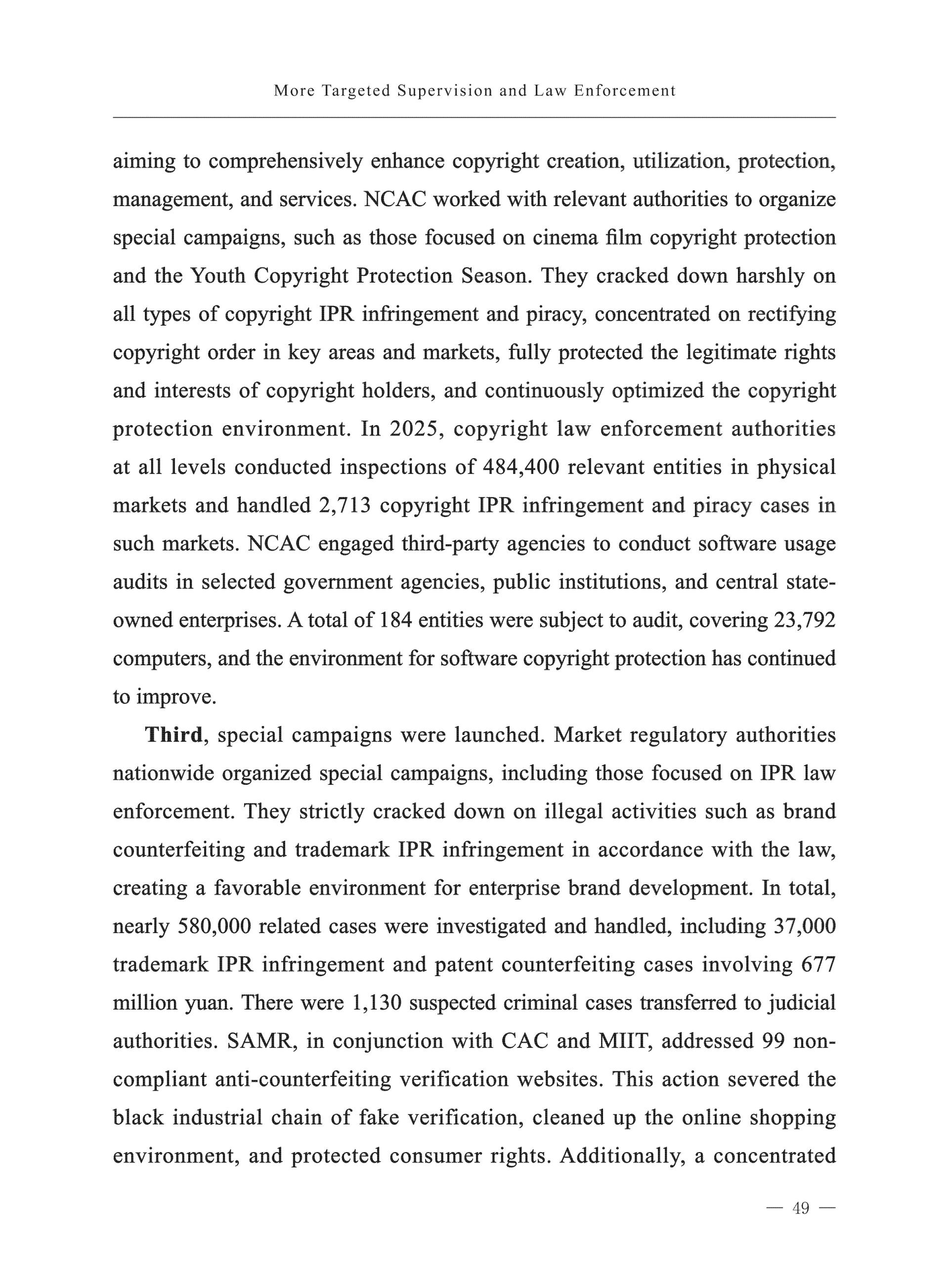 The Report summarizes China’s work on intellectual property protection and combating counterfeiting and infringement during the 14th Five-Year Plan period, analyzes the domestic and international economic situation in 2025, and comprehensively elaborates on the progress and achievements of China’s efforts in combating counterfeiting and infringement in 2025 from seven aspects: coordinated advancement, legal guarantees, administrative enforcement, judicial protection, regulatory services, publicity and guidance, and international cooperation. The Report is released bilingually in Chinese and English, enhancing the international community’s understanding of China’s efforts in combating counterfeiting and infringement.