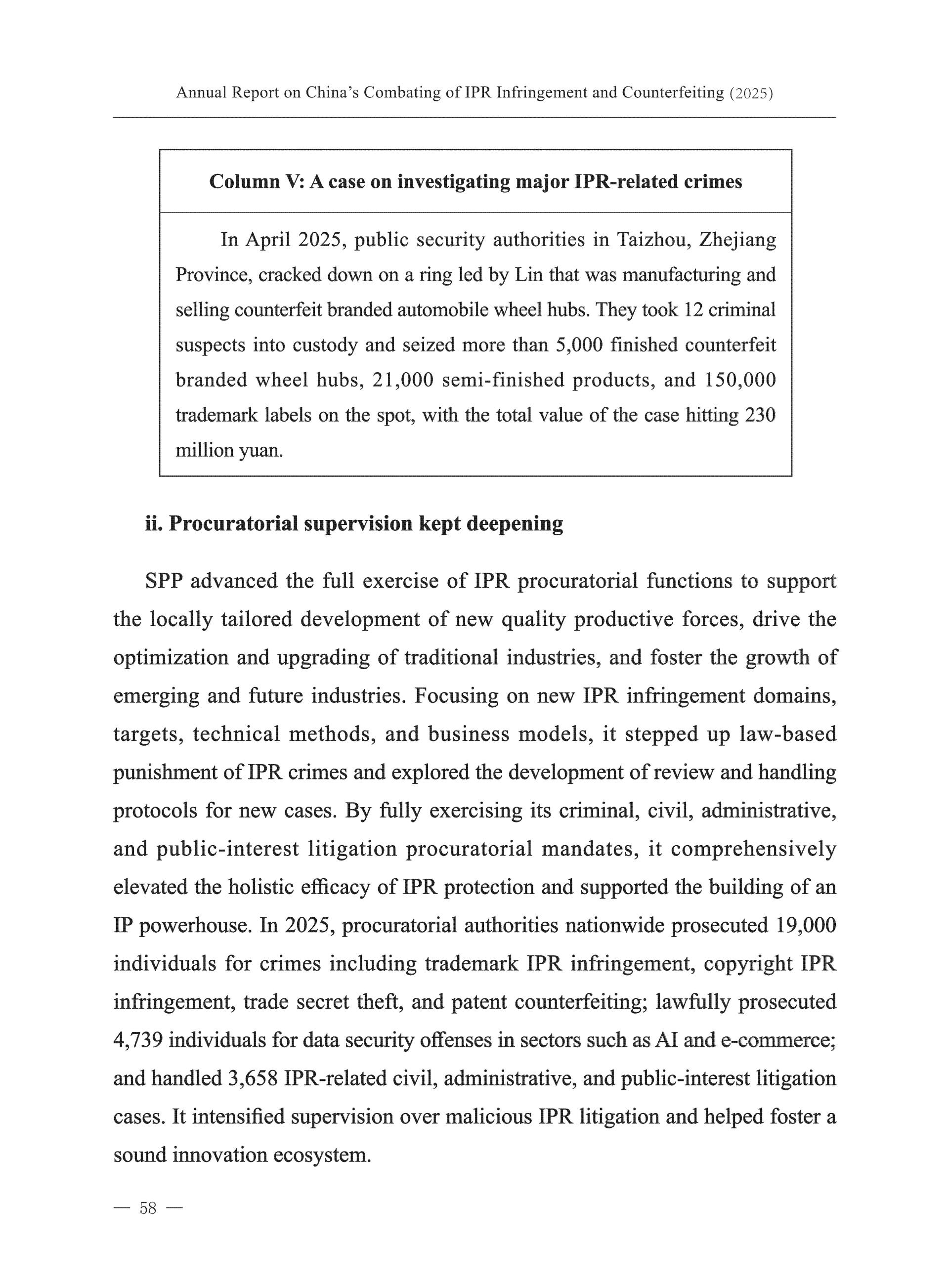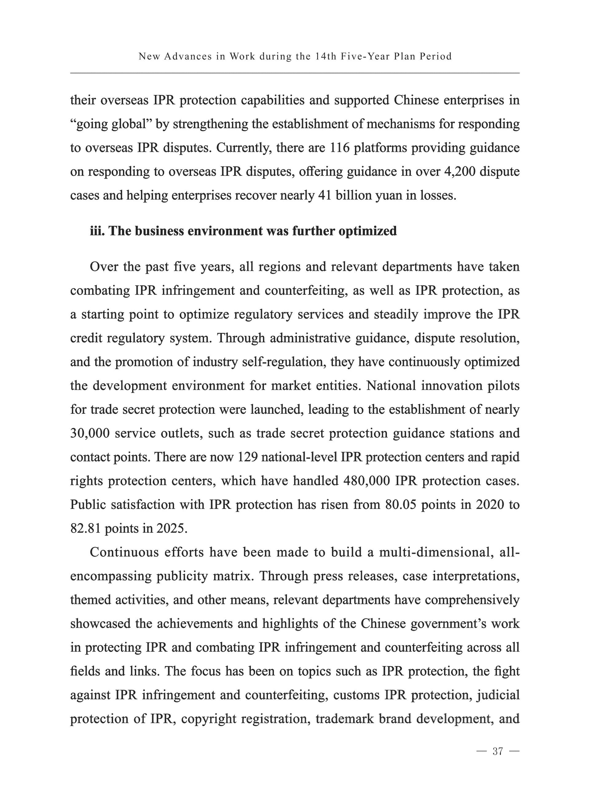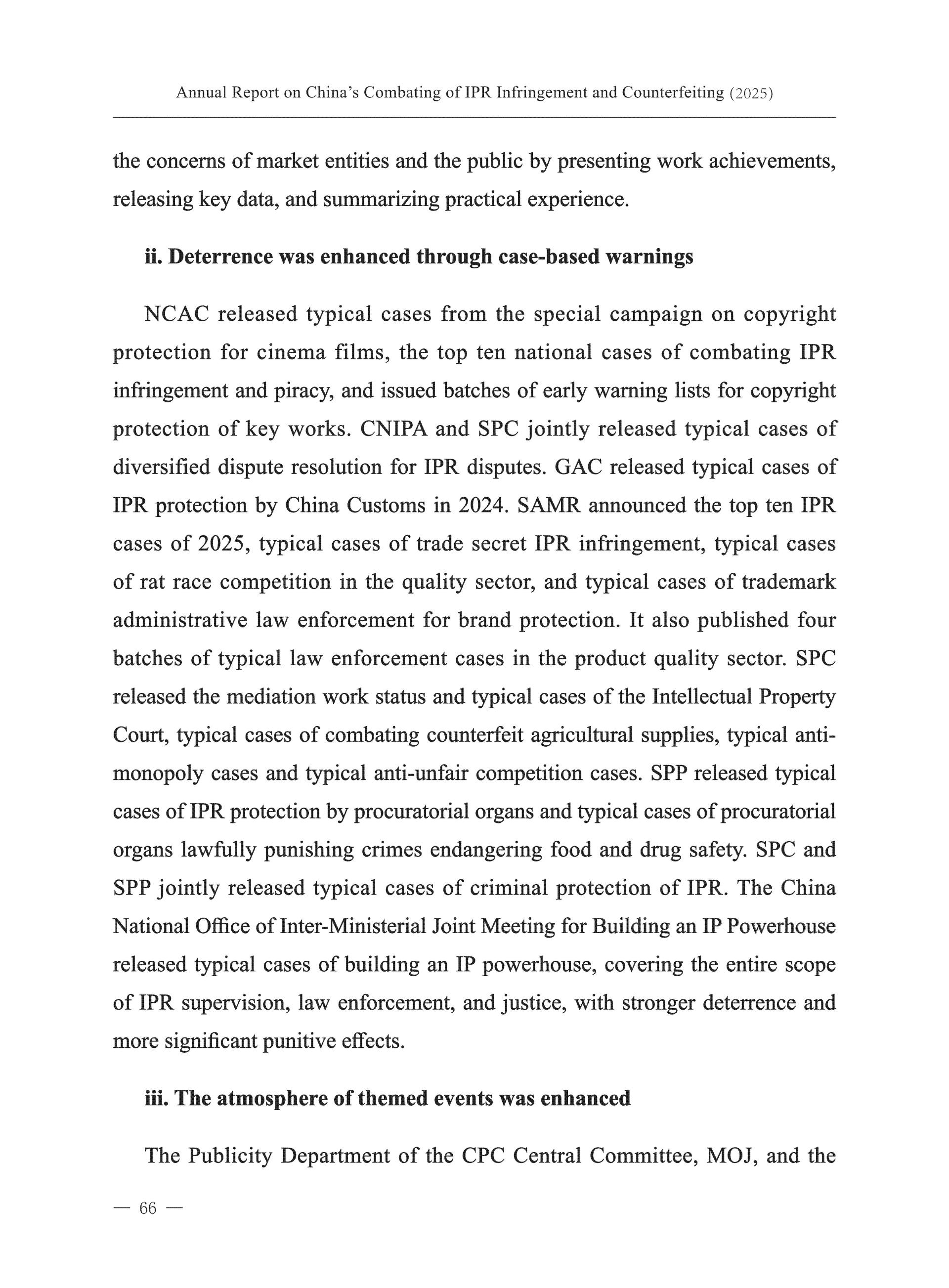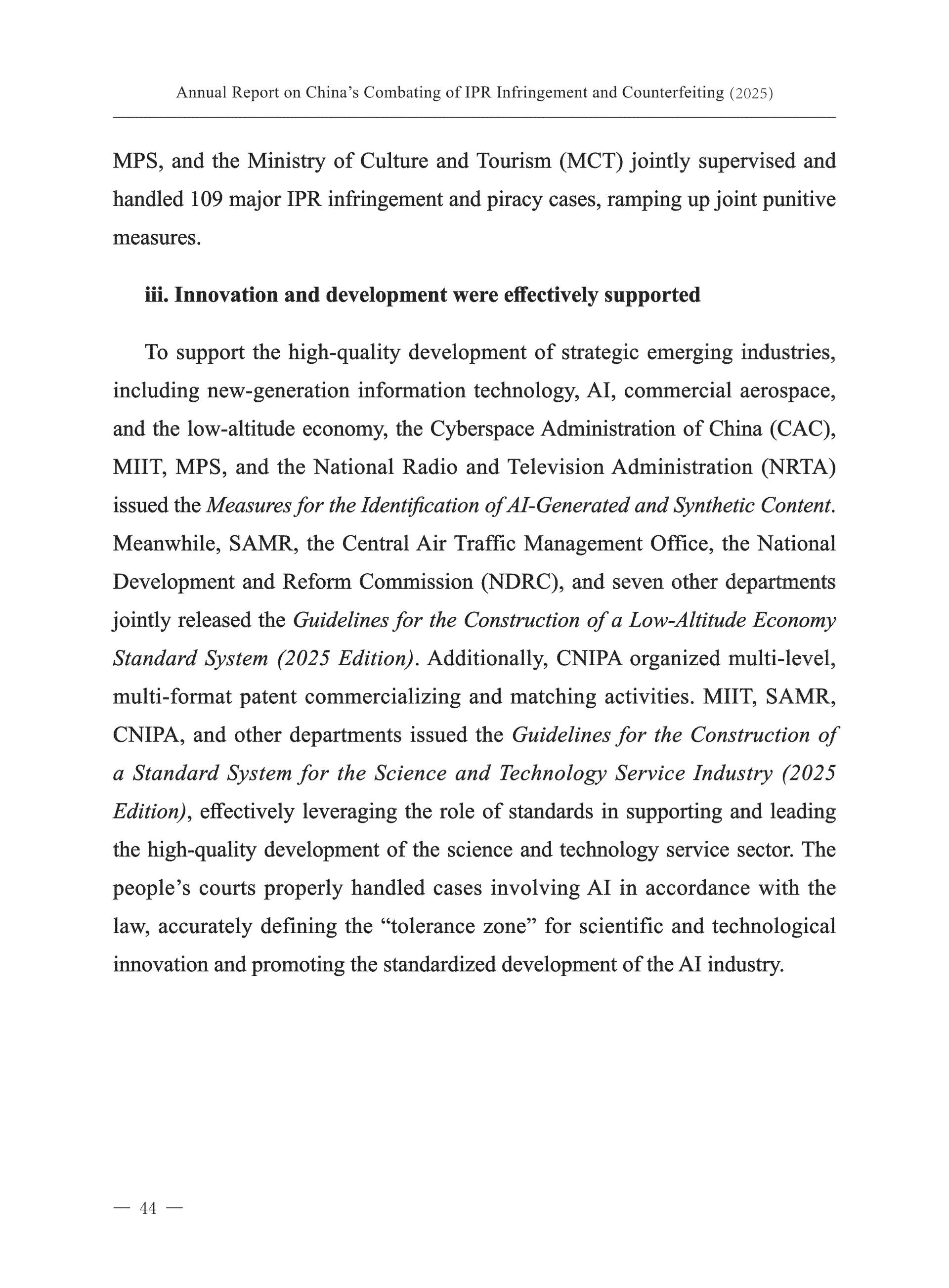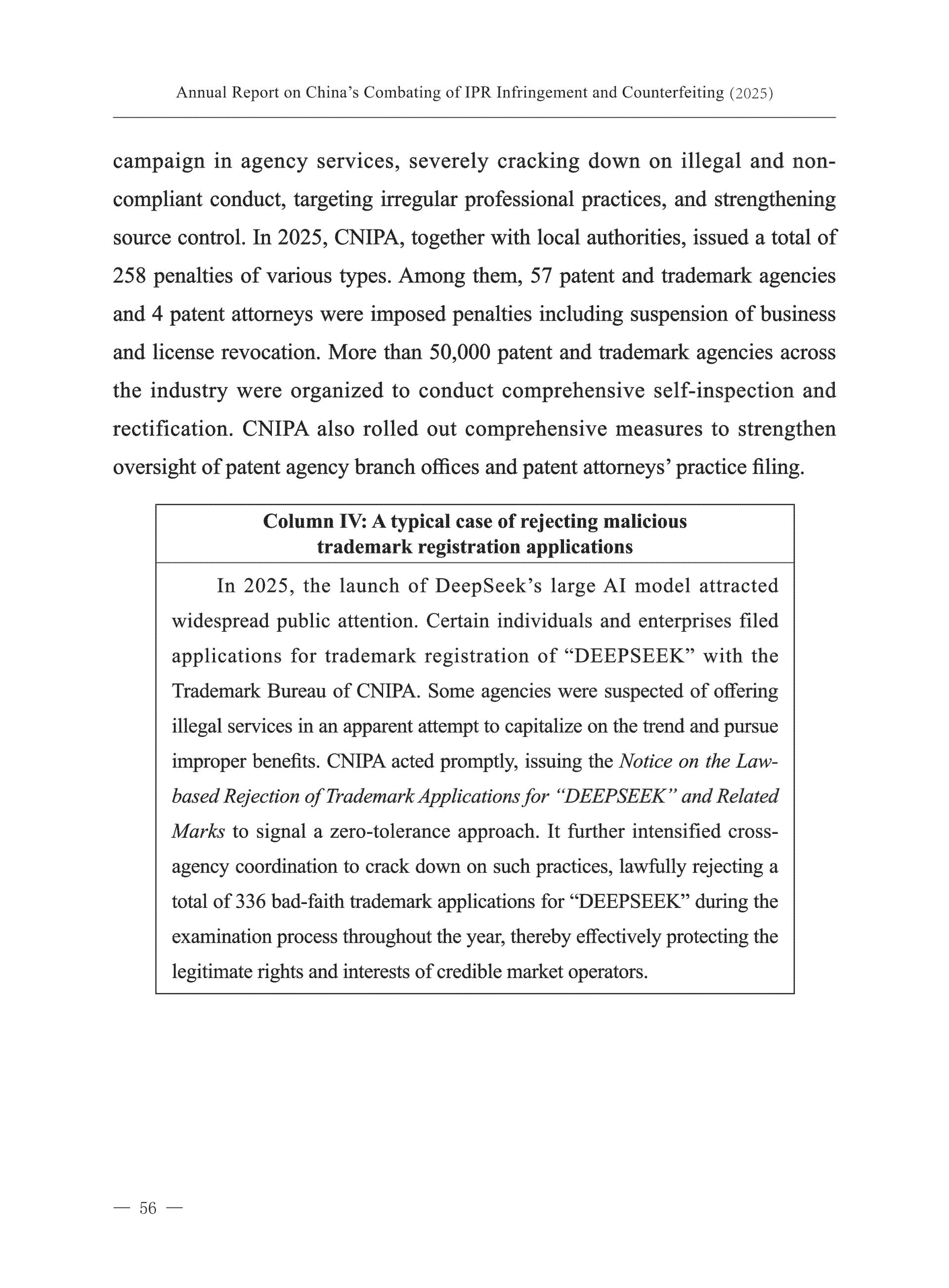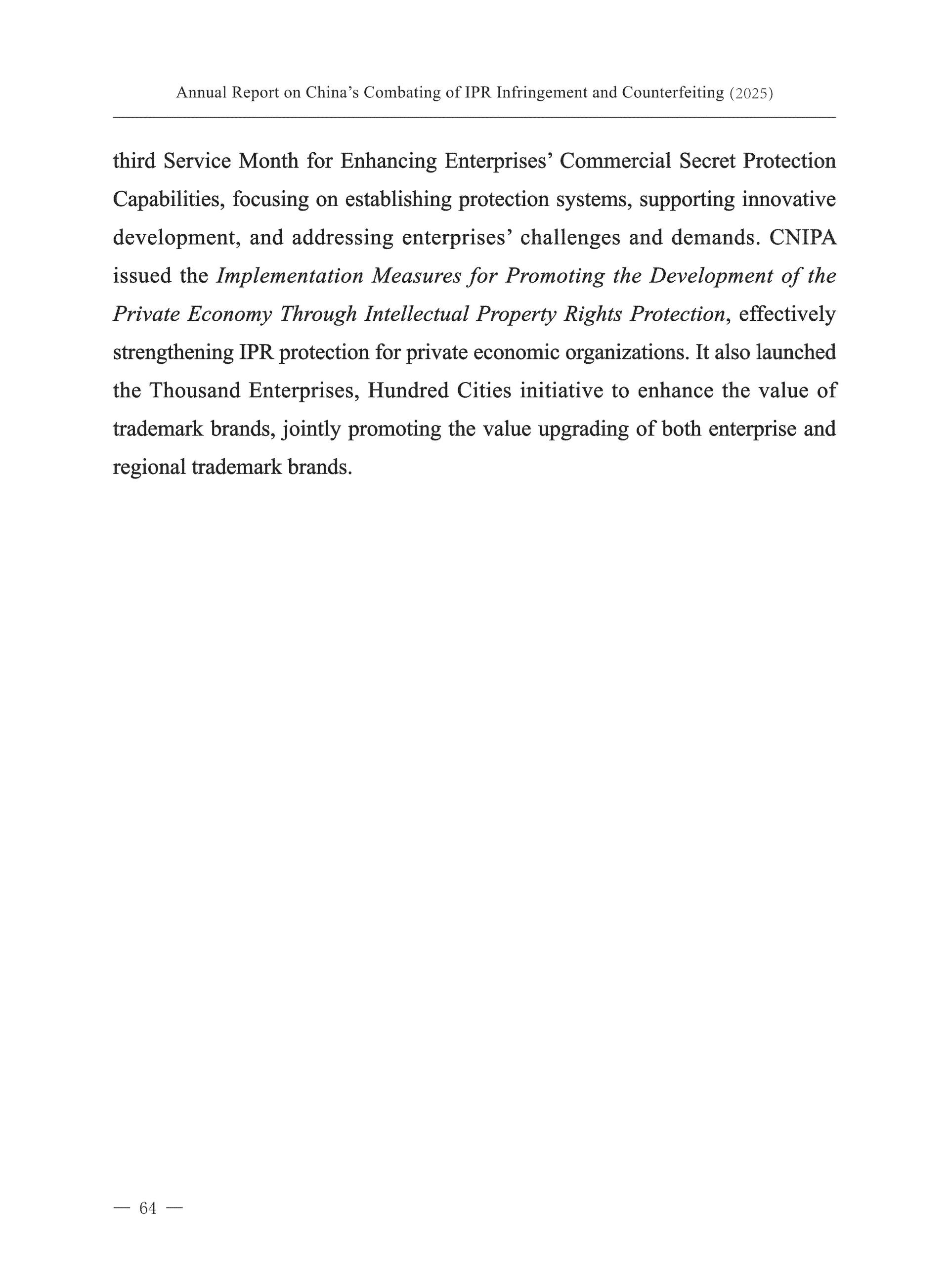 The Report summarizes China’s work on intellectual property protection and combating counterfeiting and infringement during the 14th Five-Year Plan period, analyzes the domestic and international economic situation in 2025, and comprehensively elaborates on the progress and achievements of China’s efforts in combating counterfeiting and infringement in 2025 from seven aspects: coordinated advancement, legal guarantees, administrative enforcement, judicial protection, regulatory services, publicity and guidance, and international cooperation. The Report is released bilingually in Chinese and English, enhancing the international community’s understanding of China’s efforts in combating counterfeiting and infringement.