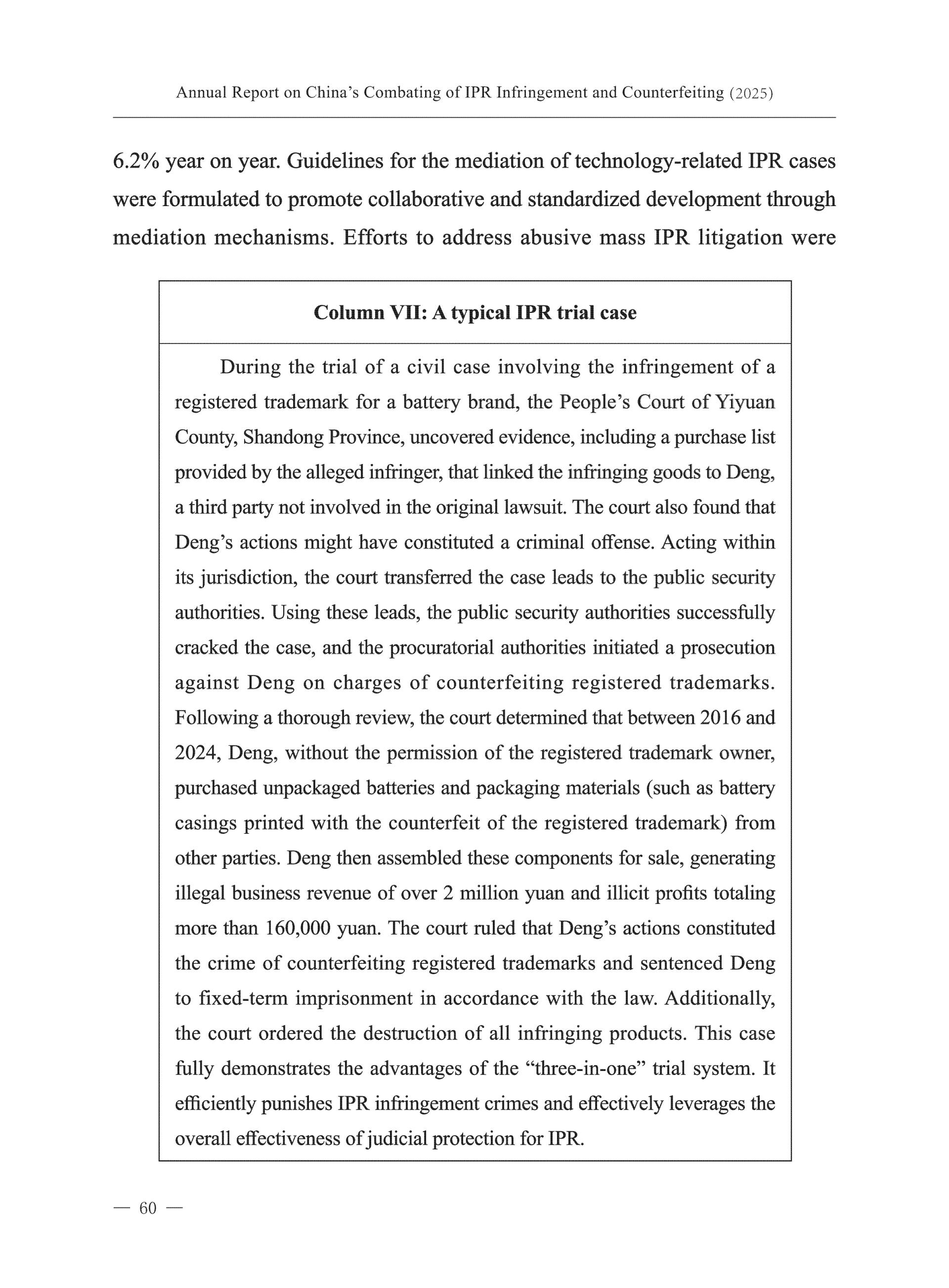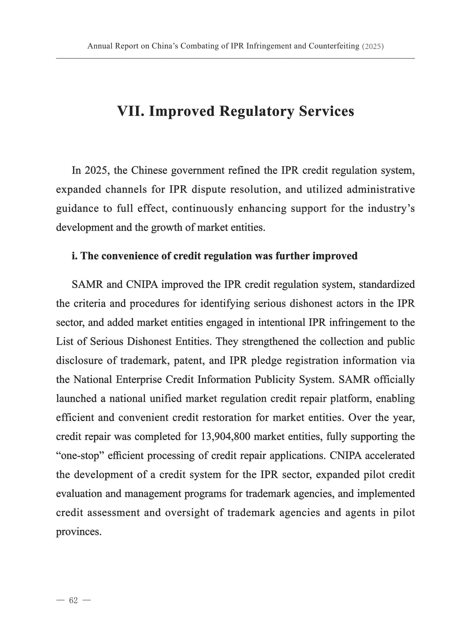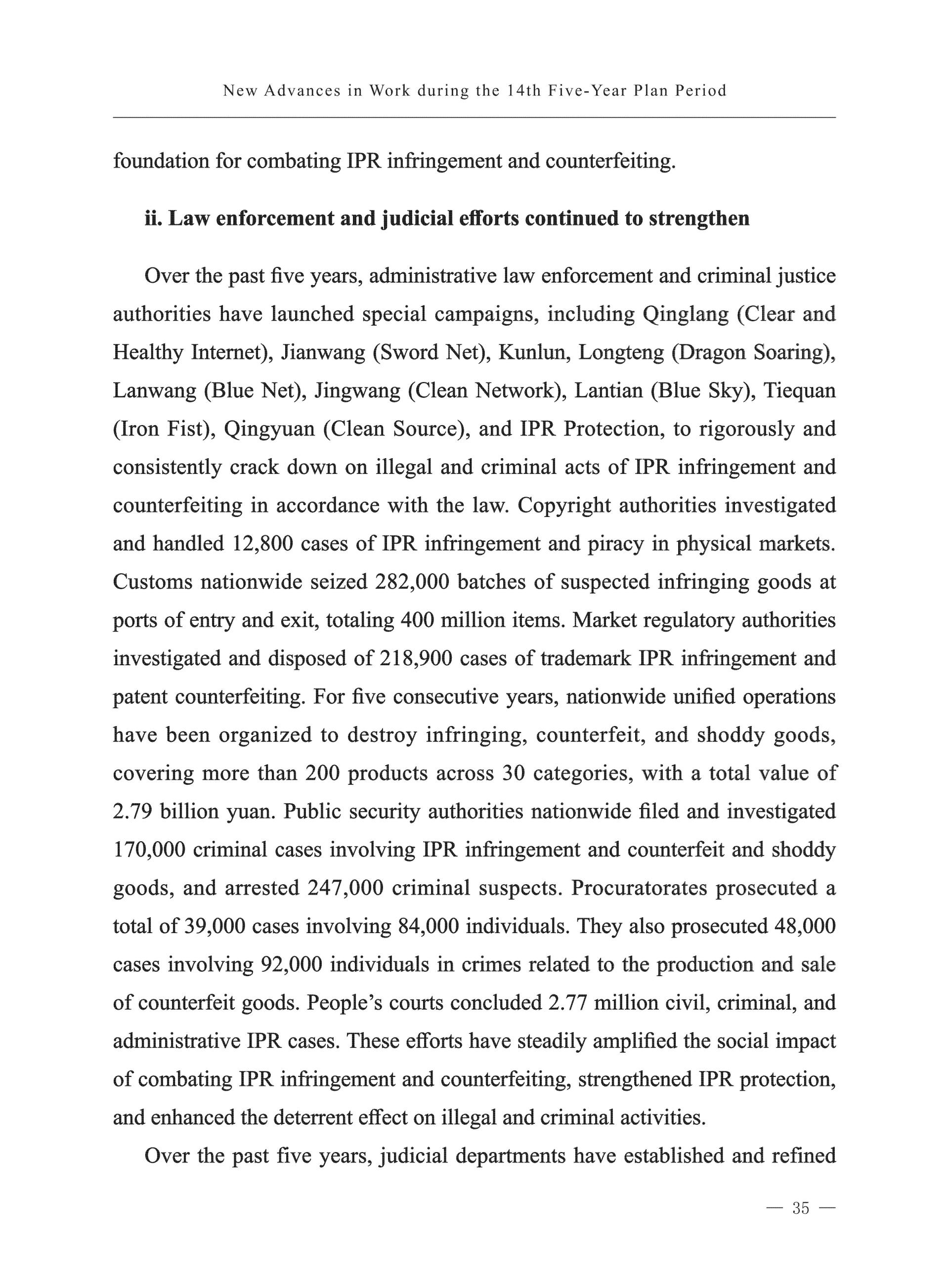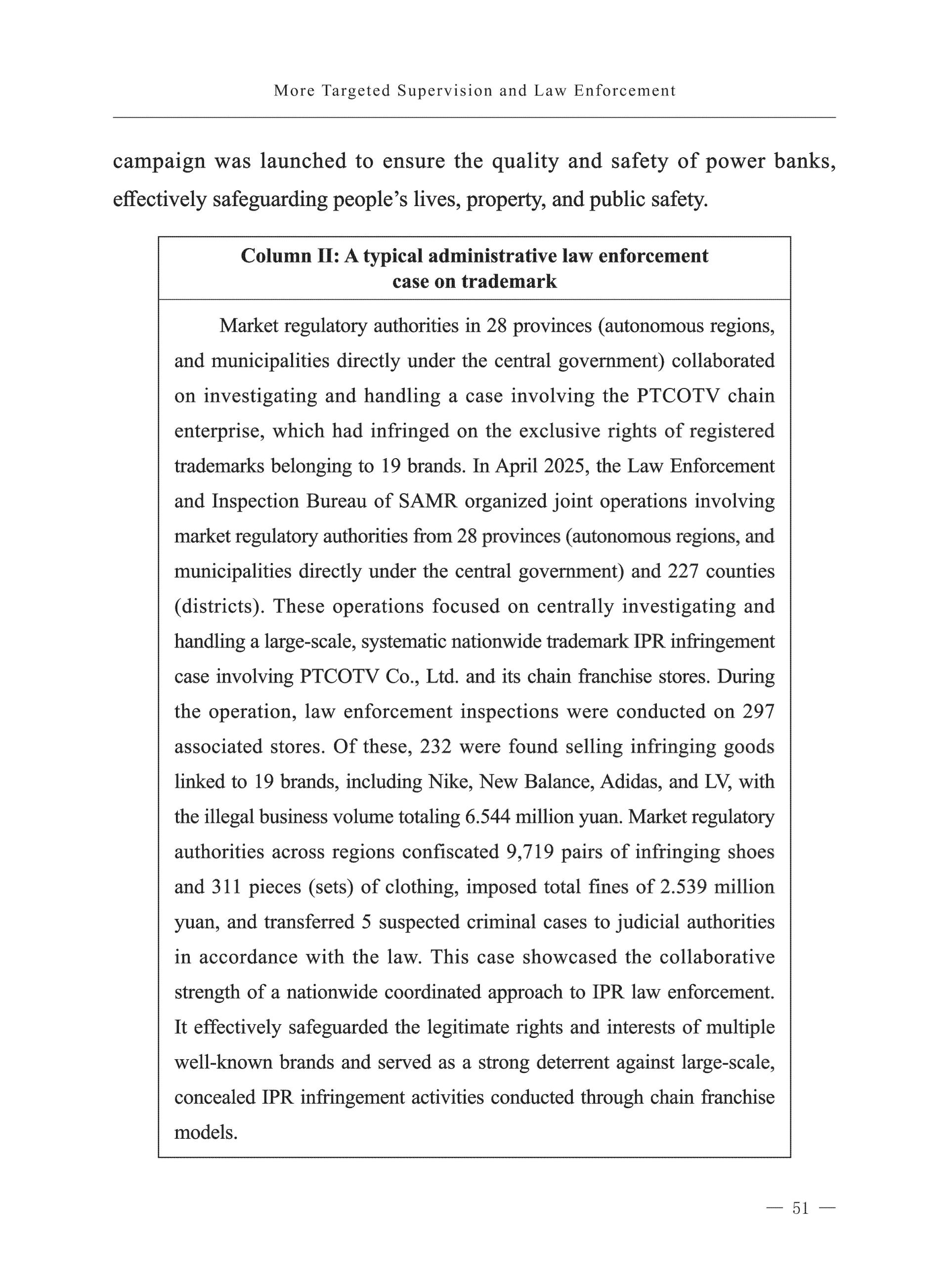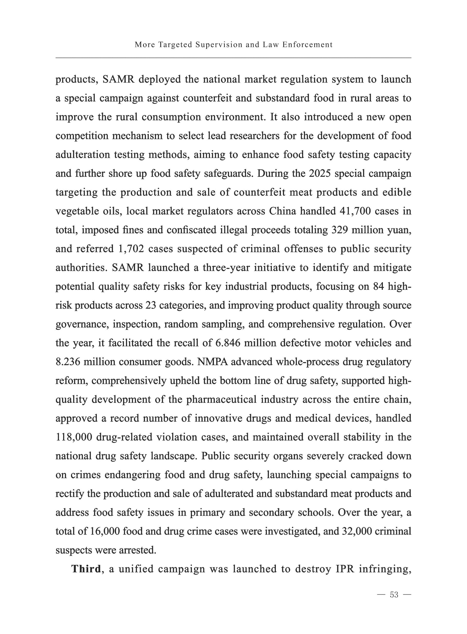 The Report summarizes China’s work on intellectual property protection and combating counterfeiting and infringement during the 14th Five-Year Plan period, analyzes the domestic and international economic situation in 2025, and comprehensively elaborates on the progress and achievements of China’s efforts in combating counterfeiting and infringement in 2025 from seven aspects: coordinated advancement, legal guarantees, administrative enforcement, judicial protection, regulatory services, publicity and guidance, and international cooperation. The Report is released bilingually in Chinese and English, enhancing the international community’s understanding of China’s efforts in combating counterfeiting and infringement.