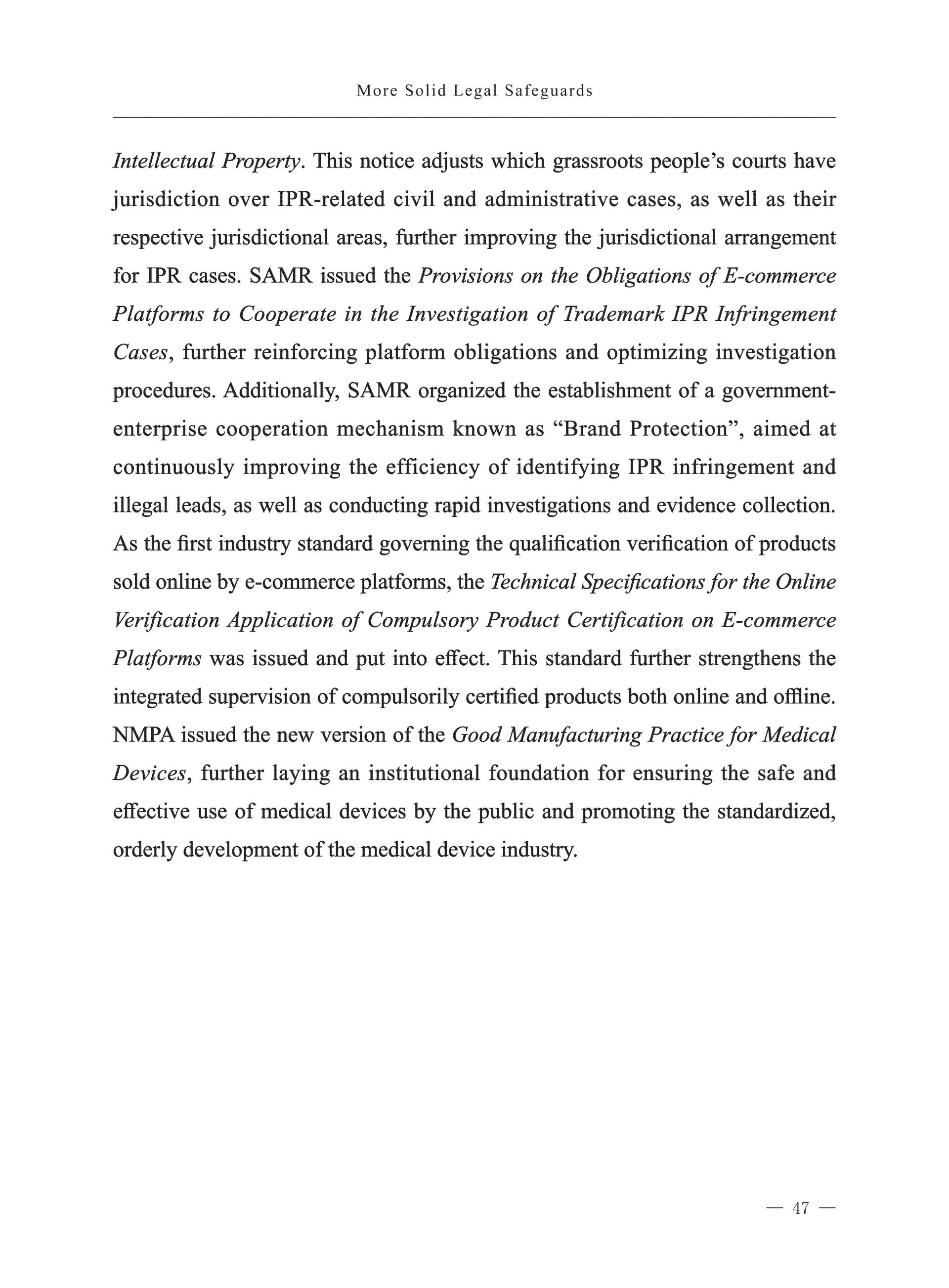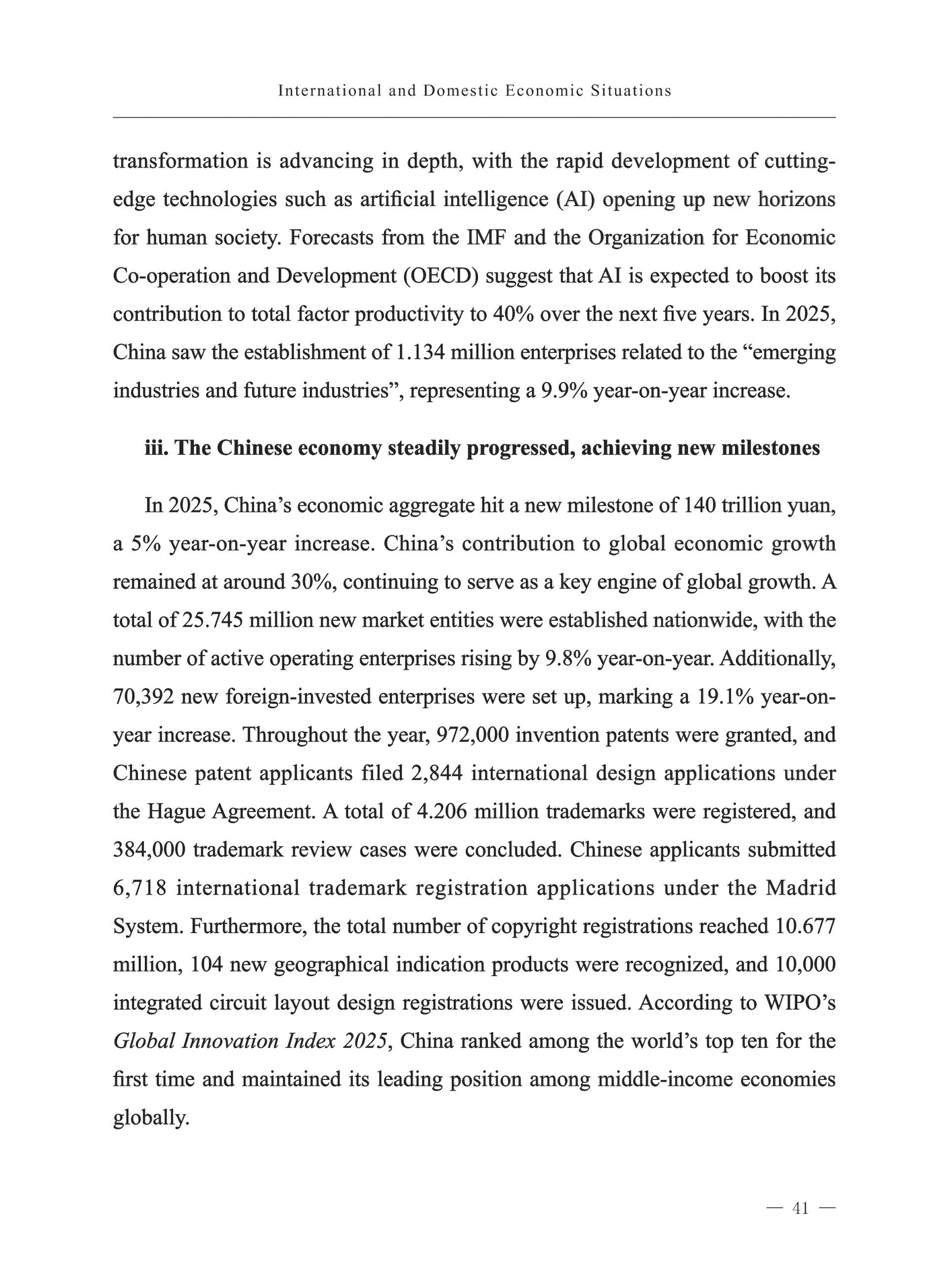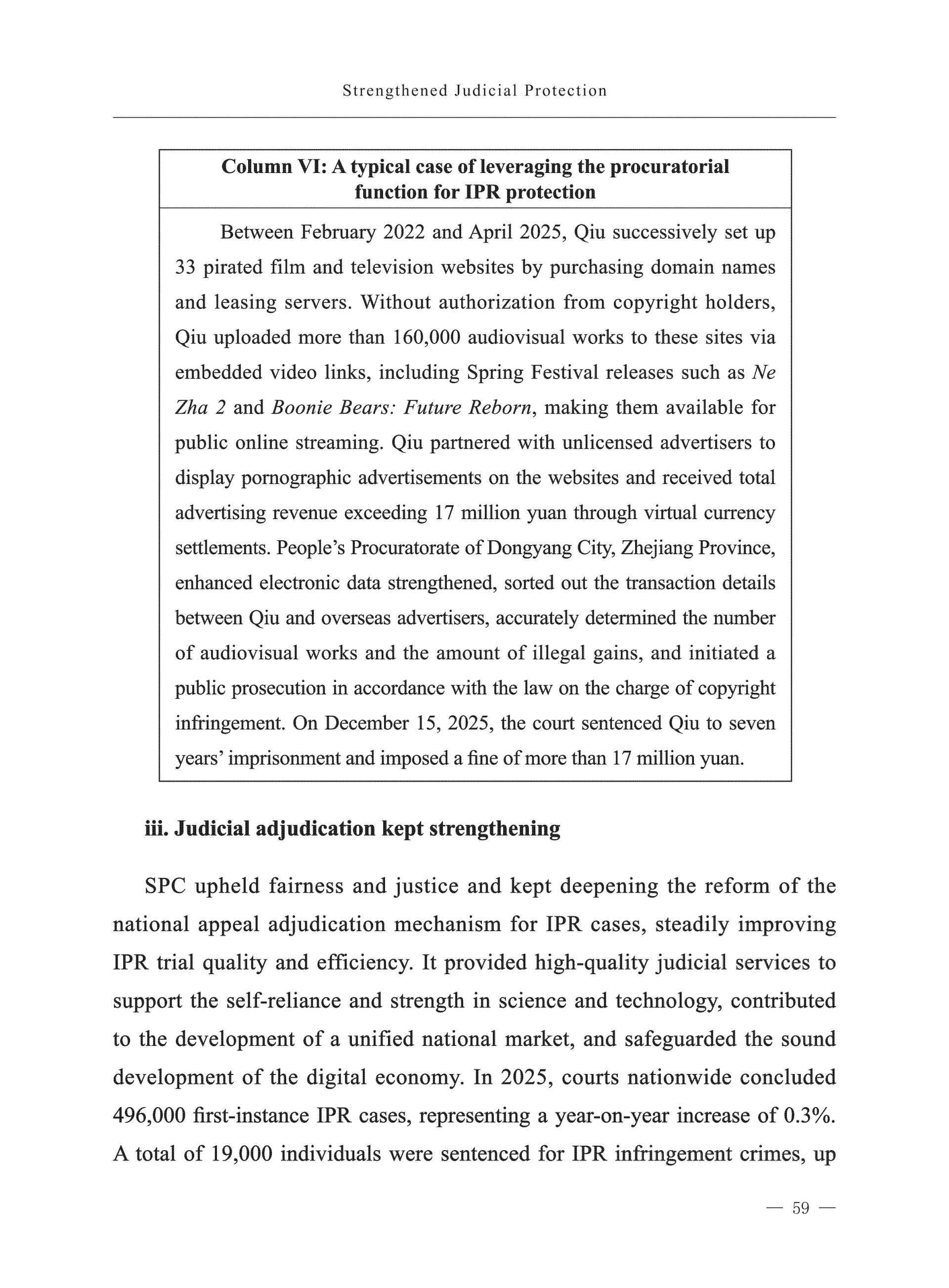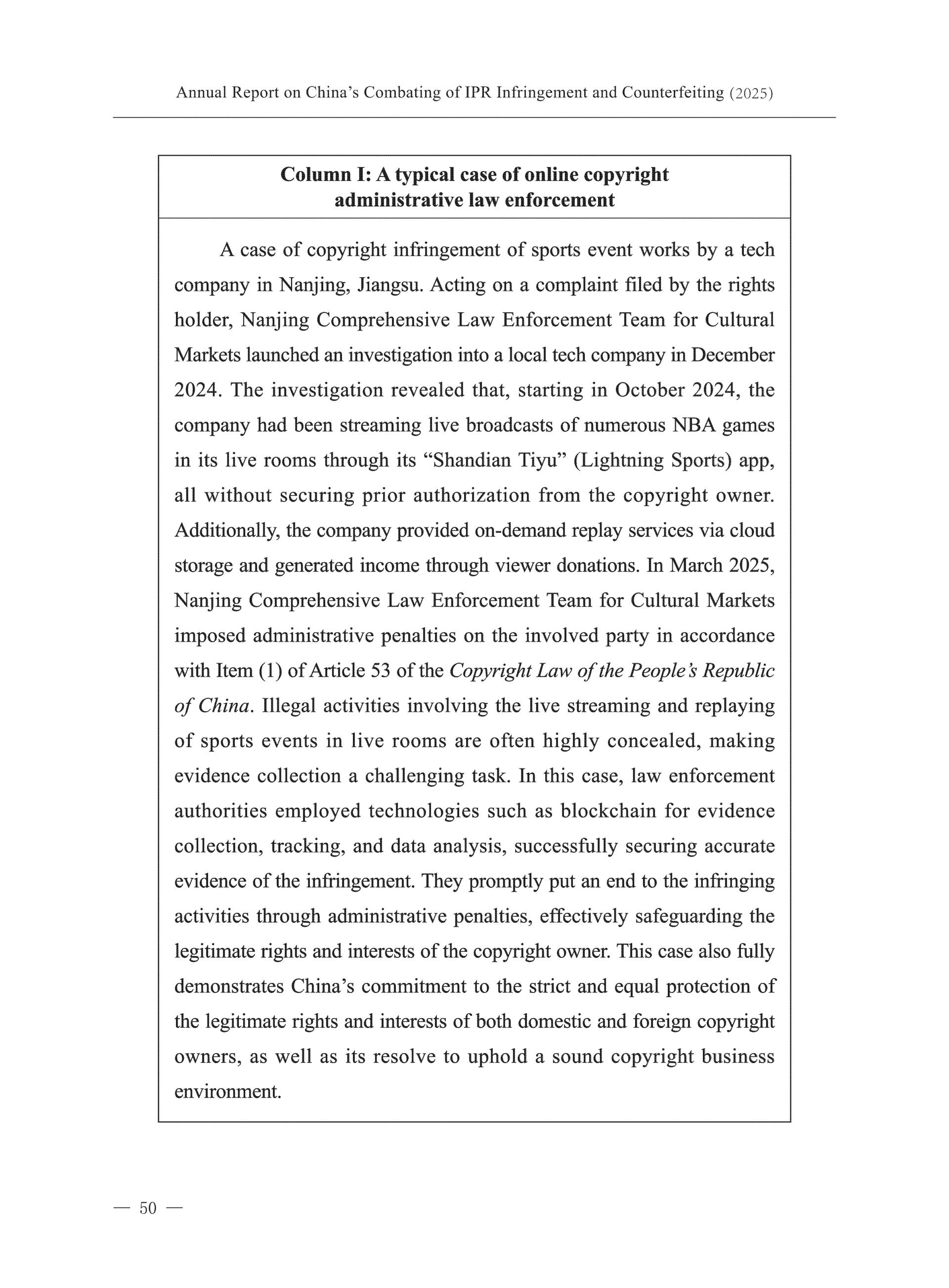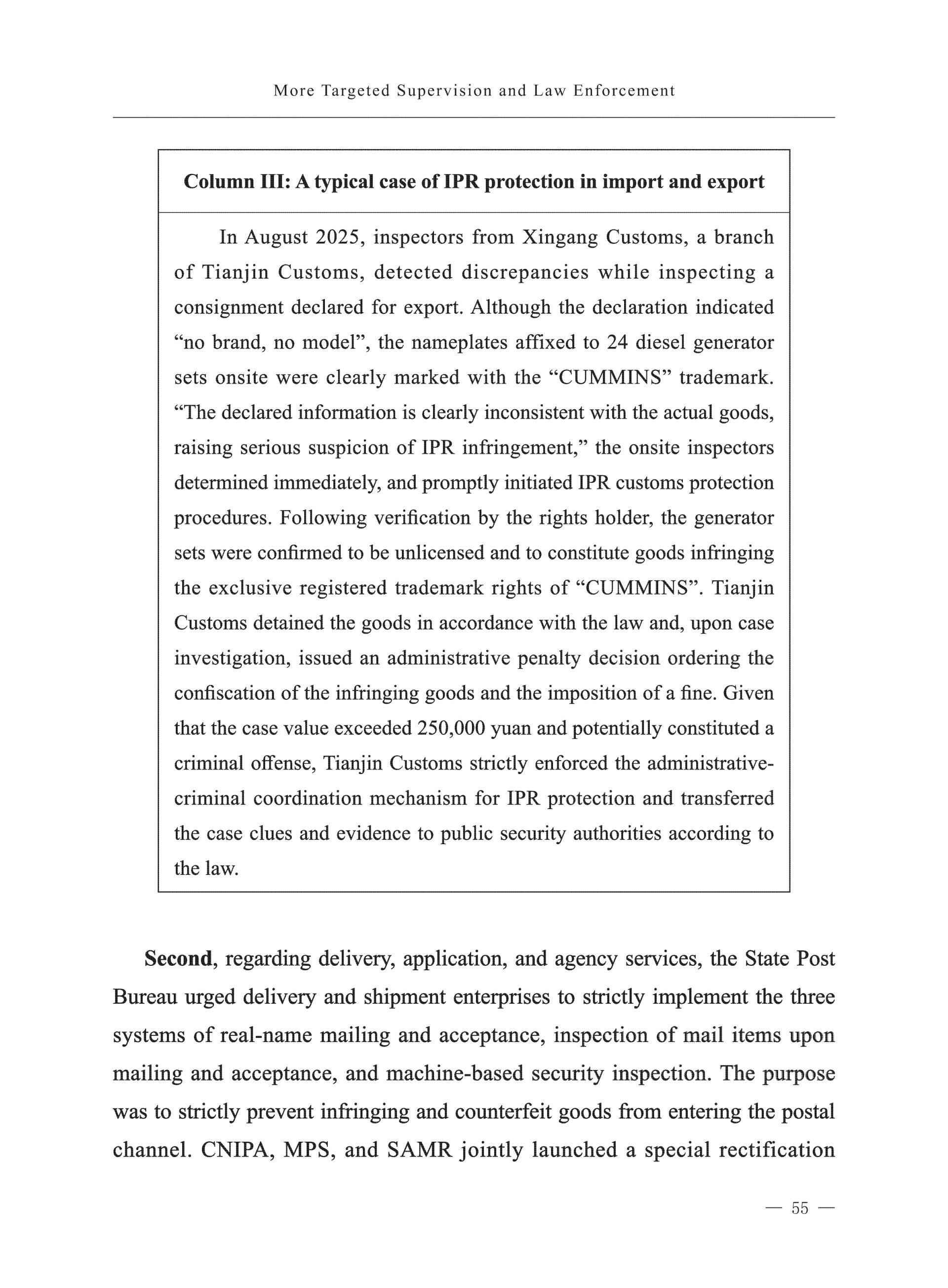 The Report summarizes China’s work on intellectual property protection and combating counterfeiting and infringement during the 14th Five-Year Plan period, analyzes the domestic and international economic situation in 2025, and comprehensively elaborates on the progress and achievements of China’s efforts in combating counterfeiting and infringement in 2025 from seven aspects: coordinated advancement, legal guarantees, administrative enforcement, judicial protection, regulatory services, publicity and guidance, and international cooperation. The Report is released bilingually in Chinese and English, enhancing the international community’s understanding of China’s efforts in combating counterfeiting and infringement.